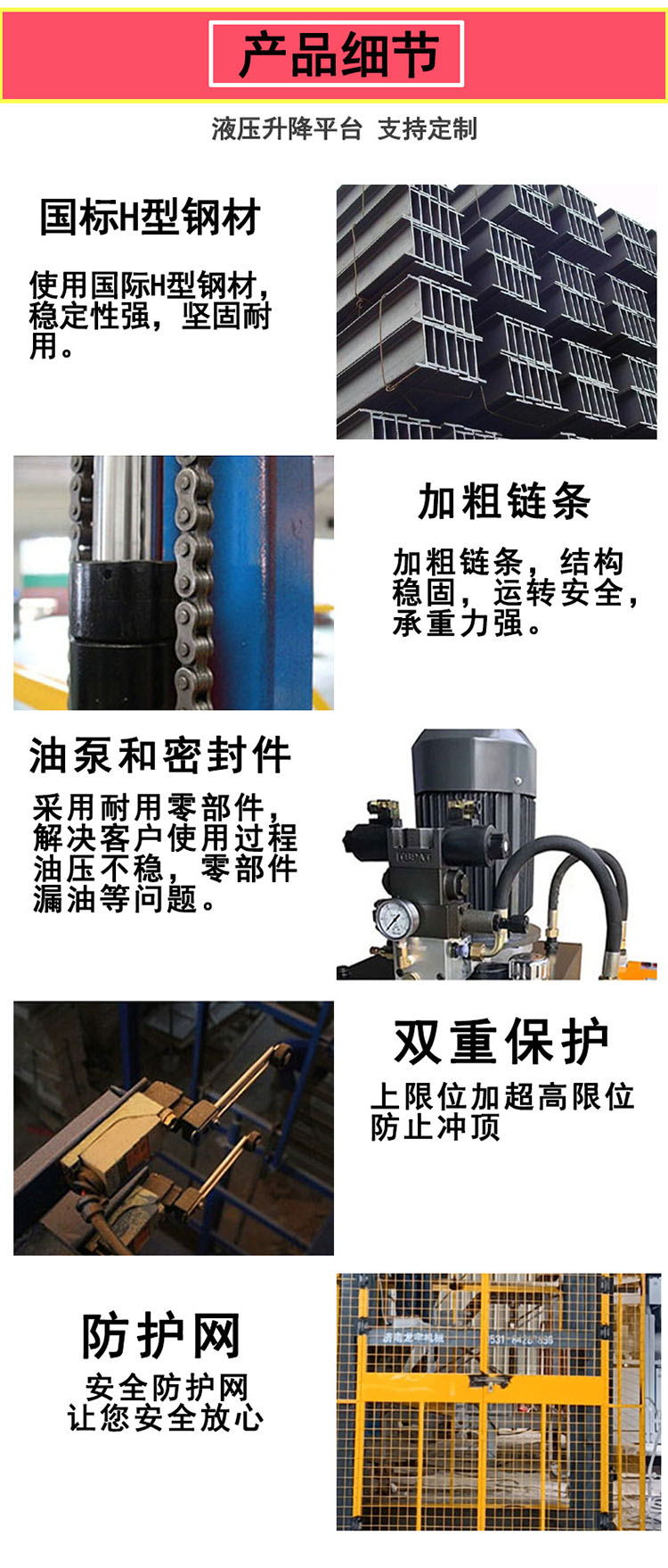 升降貨梯采用電動液壓運行原理,軌道式運行結(jié)構(gòu),升降平穩(wěn),承載量大,適合工廠、倉庫、車間、超市多種環(huán)境樓層貨物運送,因此也被稱作“運貨升降機”或“載貨電梯”。